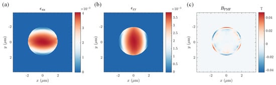 according to the analytical calculation of the axisymmetric version of Equation (19). Using to fitted the x and y directions of the bubble respectively, we obtained the corresponding parameters and . These parameters were then substituted into the Equation (22) to derive and . We approximated that through applying and , respectively, at the membrane boundary to constrain the displacement of the nanobubbles at the boundary to zero. Subsequently, the strain field within the boundaries was obtained, as shown in Figure 6a,b.