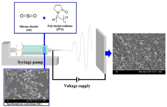 A variety of bacteria, including gram-positive and gram-negative, have been encapsulated in nanofiber structures. For example, Lactobacillus acidophilus has been added to polyvinyl alcohol and PVP nanofibers to treat bacterial vaginosis and wounds [19,20]. Polyvinyl alcohol and polyethylene oxide nanofibers have also been used for the encapsulation and delivery of intestinal probiotics [21]. However, only a few studies have been conducted on the encapsulation of microorganisms in PVP and inorganic composite nanofibers. Saccharomyces cerevisiae (SC) has been reported to have excellent antioxidant and antibacterial effects and has been reported as a new active substance related to wound recovery [22,23]. Therefore, in this study, we attempted to manufacture a wound dressing containing SC that has the function of promoting wound recovery. Electrospinning technology was used to maximize the wound dressing effect by loading heat-sensitive active substances.