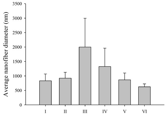 Formulations I and II in Table 1 were prepared under the same conditions using only 100% ethanol as the solvent, and water was added for SC loading to prepare formulations III to VI with the same composition as formulation II, but with different solvent compositions. Figure 2 shows SEM images of the resulting composite nanofibers. Figure 3 shows the average nanofiber diameter. Nanofiber structures were manufactured in both formulation I without SD and formulation II with SD, and the average nanofiber diameter increased from 832.4 ± 235.4 nm to 924.5 ± 201.1 nm when SD was added, but there was no significant difference. We focused on using only generally regarded as safe (GRAS) solvents to manufacture the nanofiber dressings. Therefore, only water and ethanol were used as solvents. Water and ethanol can be used in the pharmaceutical field and have been used for electrospinning in other studies [39]. Formulation III was evaluated to maintain the same polymer concentration as in formulation II and to evaluate the effect of the type of solvent. Formulations III–VI were prepared by varying the solvent composition and water–ethanol ratio. As shown in Figure 2, nanofibers of formulations III and IV, with high water content, contained bead-like morphological modifications (Figure 2C,D). Beads produced by electrospinning are the result of surface tension that overcomes the forces of jet elongation produced by electrospinning [40]. Previous research suggests that the boiling point of the solvent, vapor pressure, surface tension, and dielectric constant are factors that affect the properties of nanofibers in electrospinning [41]. The bead morphology was eliminated by increasing the proportion of ethanol in the electrospinning solution to promote sustained jet elongation. Therefore, nanofibers in formulations V and VI did not contain beads (Figure 2E and 2F, respectively). Additionally, as the ethanol ratio in the solution increased, the average diameter of the nanofibers decreased, as shown in Figure 3. In the electrospinning method, a high voltage induces a charge in the solution, which is necessary to initiate electrospinning because the surface tension is overcome by the electrostatic forces of the solution. Therefore, the dependence of surface tension on solvent composition is an important variable in electrospinning [40]. By increasing the solvent proportion of ethanol, which has a relatively low surface tension, the ratio of PVP–SD–water–ethanol in formulation VI was 4:0.1:4.8:1.2 (weight ratio), and the average particle size was the smallest, at 624.7 ± 99.6 nm. Therefore, formulation VI, which produced nanofibers with the smallest diameter without bead deformation, was determined to be the optimal composition.