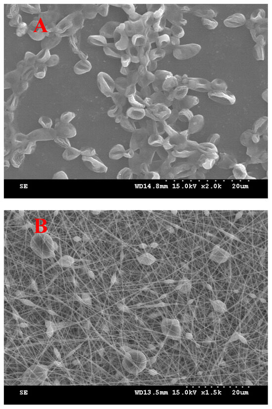 Scanning electron micrograph: (A) SC (×2000) and (B) SC-loaded PVP/SD nanofiber (formulation VII) (×1500).