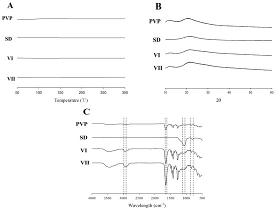 (A) DSC graphs, (B) XRD patterns, and (C) FTIR spectra: PVP, SD, PVP/SD nanofiber without SC (formulation VI), and SC-loaded PVP/SD nanofiber (formulation VII).