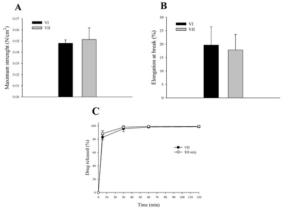 Effect of SC on tensile strength (A), break elongation (B), and SC released (C). Formulation VI was composed of PVP, SD, water, and ethanol. Formulation VII was composed of SD, PVP, SD, water, and ethanol.