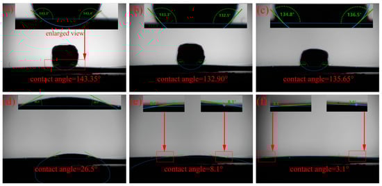 Photographs of the Mg-Ti contact angle test: (a) 25 °C, (b) 850 °C, (c) 900 °C, (d) holding the temperature at 900 °C for 1 min, (e) holding the temperature at 900 °C for 3 min, and (f) holding the temperature at 900 °C for 5 min.