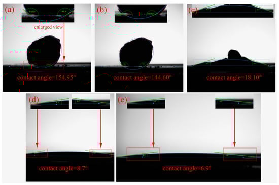 Photographs of the MgCl2-Ti contact angle test: (a) 25 °C, (b) 714 °C, (c) 900 °C, (d) holding the temperature at 900 °C for 1 min, and (e) holding the temperature at 900 °C for 5 min.