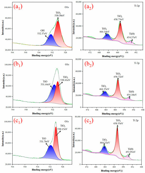 O1s XPS spectra of micron-sized titanium particles sintered at 1100 °C in (a1) a molten Mg media, (b1) a molten Mg:MgCl2 (1:1) media, and (c1) a molten MgCl2 media. Ti2p XPS spectra of micron-sized titanium particles sintered at 1100 °C in (a2) a molten Mg media, (b2) a molten Mg:MgCl2 (1:1) media, and (c2) a molten MgCl2 media.