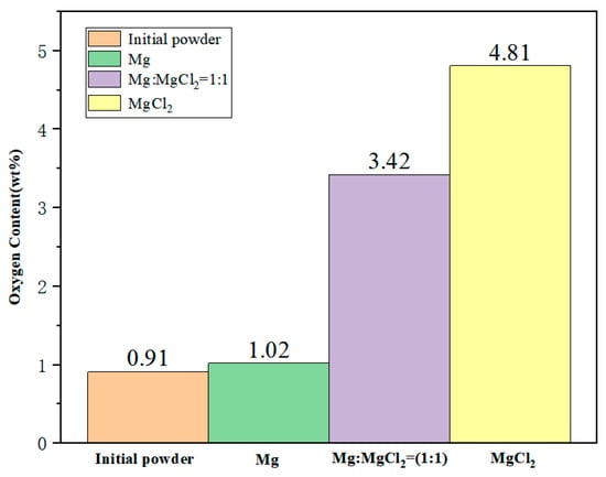Figure 4 illustrates the changes in oxygen content of titanium particles after liquid-phase sintering in different mediums. In molten Mg, the oxygen content of titanium particles increases by only 0.11 wt% (growth rate: 12.1%). In the medium of molten Mg:MgCl2 = 1:1, the oxygen content increases by 2.51 wt% (growth rate: 275.8%). In molten MgCl2, the oxygen content increases significantly by 3.90 wt% (growth rate: 428.6%). The oxygen content in titanium particles increases with the increase in molten MgCl2 content. This is because a small amount of water-absorbing MgCl2, when melted, results in the adsorption of MgO on the surface of titanium particles. Furthermore, molten MgCl2 cannot effectively reduce the oxide layer on the surface of titanium particles. On the other hand, molten Mg can help reduce the increase in oxygen content on the surface of titanium particles during sintering. However, MgO, a by-product of the reduction process, is difficult to eliminate from the surface of titanium particles and remains within the particles after distillation. As a result, compared to other mediums, the titanium particles sintered in molten Mg show the smallest increase in oxygen content.