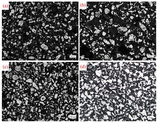 Figure 5 depicts a metallographic photograph of titanium particles aggregated in a molten MgCl2 medium at different temperatures for 2 h. In the metallographic diagrams, white area represents titanium particles or aggregates, while black area represents pores. As the temperature increases, the wettability between the liquid phase and the solid phase improves [29,30]. The molten medium can spread more thoroughly over the surface of the titanium particles, enhancing the capillary forces between them and accelerating their aggregation. At 800 °C (Figure 5a), the number of titanium particles in the medium per unit area is small and sparsely distributed, accounting for 17.2% of the area. As the temperature increases to 900 °C and 1000 °C (Figure 5b,c), the number of titanium particles in the medium per unit area begins to increase, and the degree of aggregation gradually intensifies. The area proportion occupied by titanium particles reaches 20.0% and 31.4%, respectively. There are still gaps between adjacent titanium particles, indicating that they have not yet fully connected with each other, and the titanium particles remain in the aggregation stage. At 1100 °C (Figure 5d), the diffusion of titanium atoms becomes more pronounced. The area proportion of titanium particles further increases to 35.4%, and adjacent titanium particles become connected, resulting in the aggregation of titanium particles and the formation of a sponge titanium skeleton.