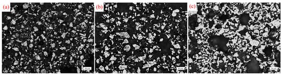 Figure 6 presents a metallographic photograph of titanium particles aggregated in a molten Mg:MgCl2 (1:1) medium at different temperatures for 2 h. The wettability between Mg and Ti is better than that between MgCl2 and Ti. In molten Mg, the capillary force between titanium particles is stronger, accelerating the aggregation speed of titanium particles. Additionally, molten Mg has a reducing effect, which reduces the oxide layer on the surface of titanium particles and weakens the obstacle to the diffusion of titanium atoms. This further accelerates the aggregation of titanium particles, allowing the formation of a sponge titanium skeleton at a lower temperature. Compared to the molten MgCl2 medium, the increased content of molten Mg in the mixed medium accelerates the aggregation rate of titanium particles. At 800 °C (Figure 6a), the proportion of titanium particles is 19.7% (an increase of 2.5% compared to Figure 5a), and their distribution remains relatively dispersed. At 900 °C (Figure 6b), titanium particles continue to gather, and their quantity increases, resulting in an area proportion of titanium particles of 21.4%. Upon reaching 1000 °C (Figure 6c), the area ratio of titanium particles reaches 32.2%. Adjacent titanium particles are connected to each other, leading to the aggregation of titanium particles and the formation of a sponge titanium skeleton.