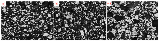 Figure 7 displays metallographic photographs of titanium particles after liquid-phase aggregating in molten Mg at different temperatures for 2 h. The content of Mg in the molten medium continues to increase, and the wetting and reducing effects of the molten medium are strengthened, which accelerates the aggregation speed of titanium particles. At 800 °C and 900 °C (Figure 7a,b), titanium particles continue to aggregate, accounting for 23.2% and 26.8%, respectively, which is significantly higher compared to the other two media. At 1000 °C (Figure 7c), the aggregation degree of titanium particles increases significantly, resulting in an area proportion of 34.3%. The titanium particles are interconnected, forming an aggregated structure resembling a sponge titanium skeleton. As the content of molten Mg in the medium increases, the aggregation speed of titanium particles also increases, leading to a higher area proportion at the same temperature.