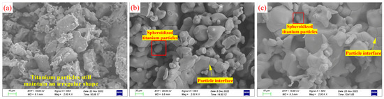 Figure 8 depicts the micrograph of titanium particles aggregated in different media at 900 °C for 2 h. In the case of aggregating in a molten MgCl2 medium, titanium exhibits no solubility, resulting in the preservation of the original irregular morphology of titanium particles. Fine titanium particles and sharp edges of titanium particles cannot be dissolved, leading to their accumulation on the surface of larger particles (Figure 8a). According to the Ti-Mg binary phase diagram [31,32], titanium possesses certain solubility in molten Mg, which increases gradually with temperature. During aggregating, particles with high surface energy and sharp edges tend to dissolve first [33]. They subsequently nucleate and precipitate on the surface of larger particles or defective areas, causing the disappearance of smaller particles and the growth and spheroidization of larger particles. This process, known as Oswald ripening, can be observed in Figure 8a,b (highlighted by the red boxes). Consequently, the fine particles dissolve and vanish, while the sharp edges of larger particles continuously dissolve and spheroidize. The Oswald ripening phenomenon of titanium particles in molten Mg accelerates the diffusion of titanium atoms through the continuous dissolution and reprecipitation of titanium. This enhances solid-phase mass transfer, accelerating the aggregation of titanium particles. The aggregation of titanium particles leads to the formation of more particle interfaces, as shown in Figure 8c. The microstructure of titanium particles after aggregation is similar to that of mesoporous hematite/alumina nanocomposites [34] and iron oxide nanochains coated with silica [35], as reported by Marin Tadic. The particles contact and adhere to each other to form a ‘spongelike’ structure, with numerous pores between the particles.