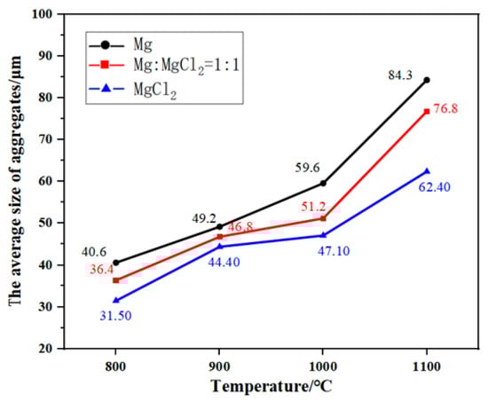 Figure 9 illustrates the changes in the average size of titanium particle aggregates with temperature after aggregating in various media for 2 h. The average size of titanium particle aggregates increases with temperature in all three mediums. In the case of aggregating in molten MgCl2, small particles accumulate on the surface of larger particles. As the temperature rises, the number and size of aggregates formed by small particles increase. In the medium containing molten Mg, titanium particles undergo continuous growth through Oswald ripening. Simultaneously, the reduction of the oxide layer on the particle surfaces by molten Mg accelerates mass transfer between titanium particles, facilitating faster particle aggregation and the formation of interfaces. With increasing temperature, the coarsening rate of particles intensifies, resulting in a greater number of particles in contact with each other and larger aggregate sizes.