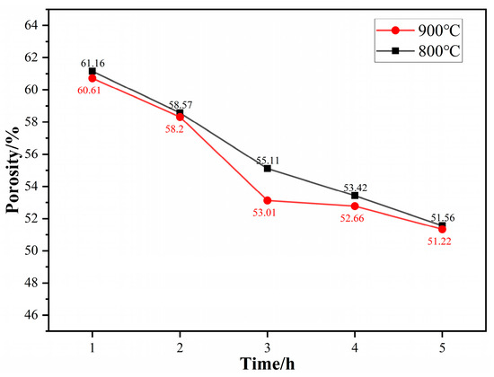 Figure 10 illustrates the porosity of titanium particles after aggregation at different temperatures and different times in MgCl2:Mg (1:1). At room temperature, the bulk density of raw titanium powder is 1.26 g/cm3, and the calculated porosity is 72.0%. After aggregating in MgCl2:Mg (1:1) at 800 °C for 1 h, the porosity of titanium aggregates rapidly decreases to 61.16%. At the same aggregation time, with the increase in temperature, the wettability, reduction, and dissolution–precipitation effect of molten Mg are enhanced, and the diffusion of Ti atoms is also strengthened, which promotes the aggregation process of the titanium particles. After the titanium particles are aggregated at 900 °C for 1 h, the porosity of the particles decreases to 60.61%. The porosity of the aggregates decreases with the increase in temperature and time.