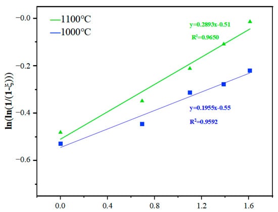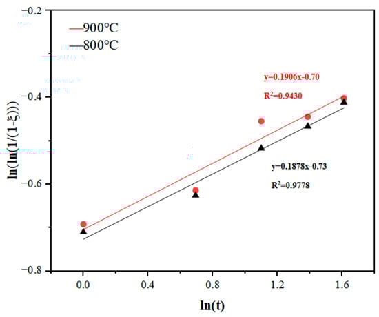 Figure 11 illustrates the fitting curves of the relationship between ln(1/(1 − ξ)) and lnt at different temperatures, which are plotted according to the data in Figure 10. As can be seen from Figure 11, the relationship between ln(1/(1 − ξ)) and lnt basically presents a linear relationship at different temperatures. According to Equation (2), the Avrami index “n” and the kinetics constant “k” can be calculated by the slope and intercept of the fitted lines in the figure, respectively, and their values are shown in Table 1.