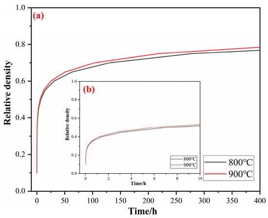 According to the kinetics equation, the corresponding kinetics curve is shown in Figure 12. At room temperature, the bulk density of raw titanium powder is 1.26 g/cm3, and its relative density is 28.0%. In this paper, it is considered that the initial relative density in the kinetics curve is 28.0% (i.e., ξ = 0.28). Figure 12a shows that at the same time, the higher the temperature, the higher the density of the titanium particle aggregates and the lower the porosity. This is because as the temperature increases, the diffusion of titanium atoms speeds up. Simultaneously, the wettability, reducibility, and solubility of molten Mg improve, promoting the diffusion of titanium atoms, accelerating particle aggregation, and reducing aggregate porosity. However, when the temperature is low, the activation energy for atomic diffusion is insufficient, and the density of the aggregates remains close to 80% even after 400 h of aggregation. Figure 12b indicates that the porosity of the aggregates increases rapidly from 0 to 3 h and then increases slowly with prolonged time. This is because during the initial 0 to 3 h, molten Mg fully dissolves the titanium in the concave–convex or angular parts of the surface, reaching dynamic equilibrium, while also essentially completing the reduction of the oxide layer on the titanium particle surfaces. Over time, the dissolution–precipitation effect significantly weakens the filling of pores, thereby slowing down the aggregation rate of titanium particles. From the kinetics curves, it can be observed that during the aggregation of titanium particles, increasing the temperature from 800 °C to 900 °C results in only a slight increase in the relative density of the aggregates at the same time. However, with prolonged time, the relative density increases significantly. This indicates that time has a more significant effect on the relative density and porosity of titanium sponge during the aggregation process.