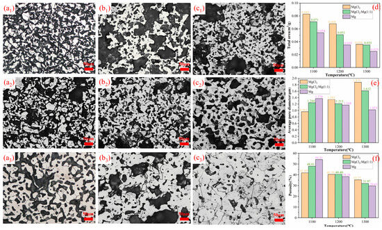 Densification behavior of sponge titanium in three different mediums and temperature: (a1–a3) represent the metallographic diagrams of sponge titanium densified in molten MgCl2 at 1100 °C, 1200 °C, and 1300 °C, respectively; (b1–b3) represent the metallographic diagrams of sponge titanium in MgCl2:Mg (1:1) densified at 1100 °C, 1200 °C, and 1300 °C, respectively; (c1–c3) represent the metallographic diagrams of sponge titanium densified in molten Mg at 1100 °C, 1200 °C, and 1300 °C, respectively; the length of the scale in the photomicrograph represents 50 μm; (d–f) represent the variations in total pore area, average pore size, and porosity of the titanium sponge samples.