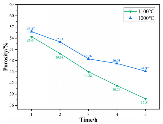 Figure 14 illustrates the porosity variation of titanium sponge in MgCl2:Mg (1:1) after densification at different temperatures and at different times. With the extension of time, the mass transfer between solid titanium is more sufficient, and the number of titanium clusters precipitated in molten Mg increases, enhancing the filling effect on the pores in the skeleton and continuously reducing the porosity of the sponge titanium. The porosity of titanium sponge decreased from 55.47% to 44.87% at 1000 °C and from 53.91% to 37.31% at 1100 °C. For the same time period, the porosity of titanium sponge at 1100 °C is lower than that at 1000 °C. This is because, at higher temperatures, the diffusion of titanium atoms and grain growth occur more rapidly, promoting the densification of the titanium sponge. Additionally, the strengthened dissolution–precipitation effect of molten Mg on titanium increases the filling effect on the pores, leading to a reduction in the porosity of the titanium sponge skeleton.
