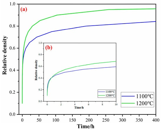 From the kinetics curves of the densification process, it is evident that the trend of relative density increase in the sponge titanium is similar over time. But at 1200 °C, the sponge titanium exhibits a significantly higher relative density. This shows that during the densification stage of the sponge titanium, temperature is the main factor affecting its relative density and porosity.