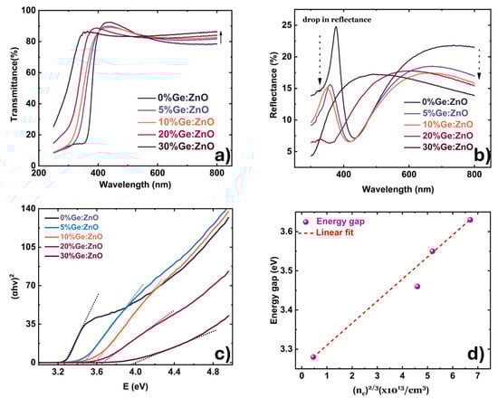 The transmittance spectra of the GZO films under investigation are shown in Figure 1a. The transmittance has been measured from 250 nm to 800 nm. The average values of the transmittance in the visible region (from 550 to 800 nm) of the GZO films show an increase compared to the undoped ZnO film. The apparent increase in the transmittance of the films with increasing Ge content might indicate a reduction in the absorption of the films. Upon examining the reflectance spectra, a similar observation was made.