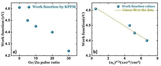 When this value is substituted in Equation (4), we observe that the Fermi level can be expressed as a function of the carrier concentration. When the work function is plotted against ()2/3, as shown in Figure 2b, it shows a negative linear relationship with the carrier concentration of the films, a trend opposite to that of the band gap. This indicates that upon increasing the Ge content in the films, the carrier density also increases, leading to the empty states in the conduction band being filled. As the band states are being occupied continuously, the Fermi level is shifted into the conduction band, causing a reduction in the measured work function, according to Equation (4). The slope of the obtained linear fitting yields an effective mass of 0.67 after calculations. Jia et al. reported an electron-effective mass of 0.95 when Al was doped into sputtered ZnO films [28]. Comparing this with the predicted theoretical electron mass, which is 0.28, there is a considerable deviation. The main causes behind this difference could arise from the segregation of impurities (secondary phases) in the film and/or the non-parabolic nature of the conduction band, which was discussed in detail previously. The presence of impurity-like features in the film has been shown to affect the work function of ZnO very strongly [32,33,34]. A more detailed discussion on the presence of secondary phases and surface states is provided in the upcoming section.