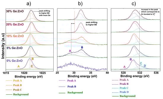 The XPS analysis of the absolute spectra of the Zn 2p line is shown in Figure 3a. Zn 2p has a doublet, namely Zn 2p1/2 and Zn 2p3/2, due to spin–orbit coupling. Since the doublets have identical features and differ only in the ratio of the areas, the upcoming discussion is limited to only the intense peak which corresponds to the Zn 2p3/2 state. The intense peak which lies between 1021.5 and 1022 eV (Table 4) in all the films can be deconvoluted into three components as shown in Figure 3a. The peak with the lowest BE of 1019 eV is present in all the samples and in almost the same proportion. This peak corresponds to the bonding of Zn with carbon species, the origin of which is suspected to be that of adventitious carbon, which is present in almost all XPS analysis. Another possibility that can explain the origin of this peak is the residual traces of the organic precursor arising from one of the ALD half reactions. The most intense component among the three, which is the peak at 1021.8 eV, corresponds to the bonding of Zn with O in the ZnO lattice. The percentage area of this peak is shown in Figure 3a, from which it is very clear that as the GGZ pulse ratio is increased, the peak area is decreased. This trend aligns with the observations from the SEM-EDX measurements and supports the observation that Zn is being substituted by Ge in the host lattice. Additionally, we also notice that the position of this peak is shifted to a higher binding energy (BE) with the inclusion of Ge in the films. The reason behind this shift in BE is due to the difference in the electronegativities of the concerned atoms and the difference in the oxidation states. Ge has a higher electronegativity than Zn, meaning the electron density around Ge bonded to O is lowered; hence, the binding energy increases. On the other hand, Ge has an oxidation state of 4+, higher than Zn2+, which also contributes to the chemical shift. The peak at the highest BE of about 1022 eV corresponds to Zn bonded with OH groups. ZnO terminated by hydroxyl groups at the surface is a well-known and widely reported aspect [37]. However, it is interesting to note that the proportion of this peak grows with the increasing Ge content in the films.