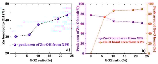 The peak areas corresponding to the bonding of Zn with OH calculated from the Zn 2p3/2 peak and the O 1s peak were combined and plotted as a function of the GGZ ratio as shown in Figure 4a. A linear relationship is observed between the number of Zn-OH bonds and the GGZ ratio. This is due to the fact that with an increasing amount of Ge pulses in the ALD cycle, more OH groups are created in the reaction, according to Equation (1), where higher GGZ pulse ratios result in steric hindrance. Similarly, the peak areas that correspond to the Zn-O bond and the Ge-O bond were plotted on a double Y scale as a function of the GGZ ratio, as shown in Figure 4b. A decrease in the peak area of the Zn-O bonds is accompanied by an increase in the peak area of Ge-O bonds simultaneously. This trend confirms substitutional doping by Ge at the sites occupied by Zn in the wurtzite structure.