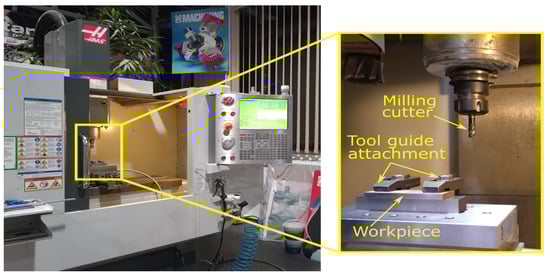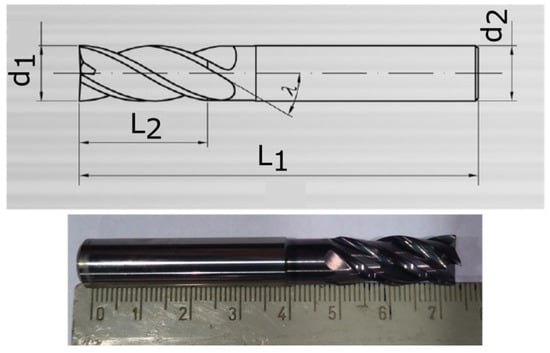 The milling process was performed on the Haas Minimill CNC machining (HAAS AUTOMATION, INC, Oxnard, CA, USA) center (Figure 2). For milling, a VHM carbide end mill with TiAIN coating was used with a working diameter of 10 mm, shank diameter of 10 mm, length of the working part of 25 mm, total length of 75 mm, angle λ = 33°, and 4 blades (Figure 3). A cutting depth of 0.4 mm was used. Additionally, during milling, the cutting force was measured for each test. The cutting force values were measured with the use of a Kistler 9257B piezoelectric dynamometer connected to a PC through a Kistler 5070B charge amplifier (Kistler Group, Winterthur, Switzerland). The PC was equipped with DynoWare software (Version 2825A, Kistler Group, Winterthur, Switzerland).