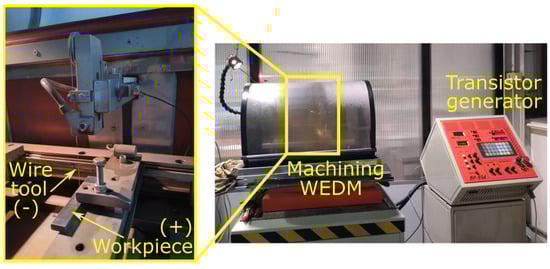 Wire electrical discharge machining tests were performed on a BP95d electroerosion cutting machine (Zakład Automatyki Przemysłowej B.P., Końskie, Poland). Figure 4 shows the research stand with the experimental setup. The influence of the current intensity amplitude on the surface roughness Ra value was analyzed. The amplitude of the current varied in the range of 16–56 A (changed every 8 A). Three repeated tests were performed for each current amplitude value. Table 8 presents the values of the adopted constant parameters and process conditions. For this process, the efficiency of electrical discharge cutting was additionally analyzed—the material removal rate (MRR) was calculated from Formula (5).