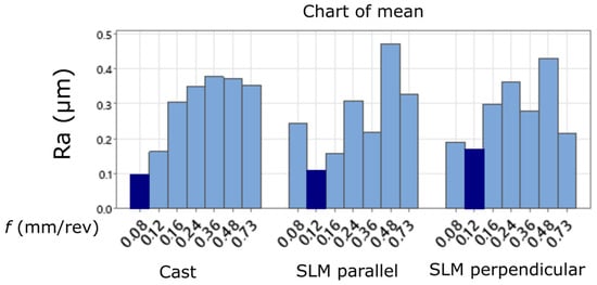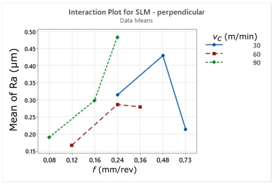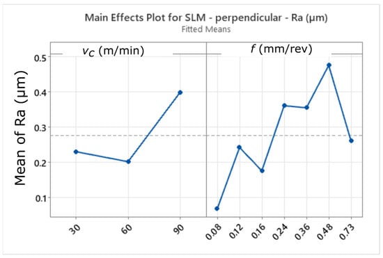 The influence of cutting speed and feed on the mean of Ra—SLM perpendicular AISI 316L.