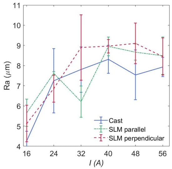 The analysis of surface roughness after WEDM did not show significant differences in the processing of the sintered material. For the EDM cutting of the sintered material and cast material, the surface roughness Ra value increases with the increase in the applied current amplitude, which is normal for this process (Figure 6).