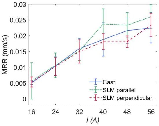 However, the surface roughness results in correlation with WEDM performance (Figure 7) show a rapid increase in the material removal rate for the application of I = 40 A. Further increasing the current amplitude results in a small increase in MRR. Hence, after taking into account the Ra roughness results, the value of 40 A can be considered optimal in this case.