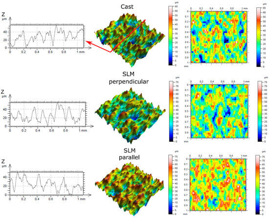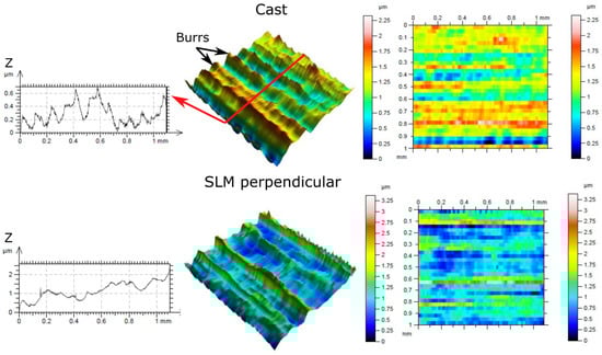 Additionally, the analysis of the surface topography revealed the presence of burrs (Figure 16). The shape of the burrs on the machined surface of the cast material and sintered material milled perpendicular to the layer arrangement was analyzed. For these surfaces, defects in the form of burrs are also similar, unlike the burrs on the surface after milling parallel to the layer arrangement. In [], it was shown that the dimensions of the material’s melting path influence the burrs that form. However, the influence of the feed direction on the layer arrangement was attributed to chip separation.