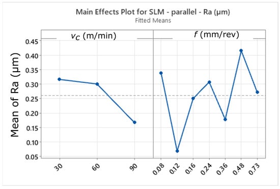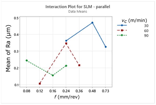 The influence of cutting speed and feed on the mean of Ra—SLM parallel AISI 316L.