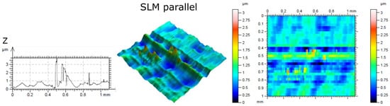 Various machining techniques can be used for the additional processing of metallic material sintered using the SLM method—conventional [,] and unconventional [,]. In [], milling was chosen as the surface treatment of material sintered using the SLM method. The study examined the influence of milling parameters and the direction of layer growth on machining. The analysis of the results showed significant differences in the milling results, which depend on the geometry and dimensions of the paths created during the SLM process. The results of these studies show that SLM technology affects the milling process.