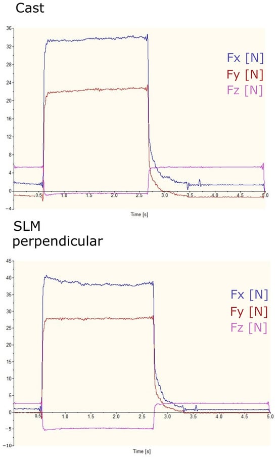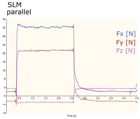 In the cutting force measurements shown below (Fx—resistive force, Fy—feed force, Fz—vertical force), similar force values are observed for the types of machining materials used for the parameters that give the best surface roughness results (Figure 17). The material production technique did not influence the forces occurring in the machining area during milling.