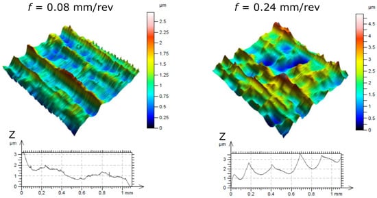 The ANOVA test showed the greatest influence on the surface roughness of the feed per revolution. Also, a comparison of the surface topography and the profile of the surface machined with feed rates f = 0.08 mm/rev and f = 0.24 mm/rev show higher burrs. Figure 18 shows this difference for a surface that was milled perpendicular to the arrangement of the sintered material layers. It can therefore be concluded that the geometric dimensions of the burrs depend mainly on the feed value. A similar conclusion was found in [].