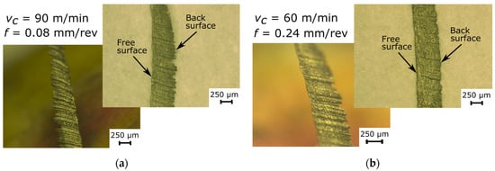 Additionally, we checked how the material was formed during milling on chips and their free surface and back surface. For a higher cutting speed (vc = 90 m/min, f = 0.08 mm/rev), the back surface of the chip turned out to be more jagged compared to the use of a lower cutting speed (vc = 60 m/min, f = 0.24 mm/rev) (Figure 20). This is due to the impact of the conditions in the processing area on the stainless steel. During machining, this steel hardens, making the chips more brittle for higher cutting speeds. This explains why the back face of the chip was more chipped when the cutting speed of 90 m/min was used. Additionally, the more chipped back face results from the slightly twisted chip geometry. When the chip was bent, chips formed more easily.