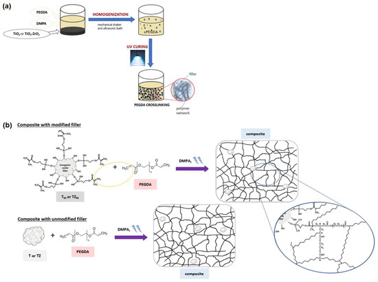 The preparation of the composites by photopolymerization as well as the structure of the composites with fillers (modified by methacryloxy groups and unmodified) incorporated into the network structure are shown schematically in Figure 2.