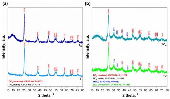 Crystalline structure of: (a) samples T and TM, and (b) samples TZ and TZM.