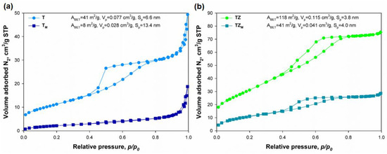 N2 adsorption/desorption isotherms of: (a) T and TM, and (b) TZ and TZM inorganic oxide fillers.
