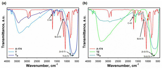 The chemical structure of the materials was investigated using FTIR spectroscopy. The analysis made it possible to confirm whether the process of the surface modification of fillers allowed the introduction of suitable functional groups on the surface of the produced materials to increase the interaction between the inorganic filler and the polymeric material (Figure 6a,b and Table 4). The FTIR spectrum of 3-(trimethoxysilyl) propyl methacrylate shows characteristic absorption bands at 830 cm−1, 910–890 cm−1, 1080 cm−1, 1087 cm−1, 1160 cm−1, 1410 cm−1, 2830 cm−1, 2950 cm−1, and 2973 cm−1, which are attributed to Si-CH2, Si-OH, Si-O, Si-O-C, Si-O-CH3, C-H, -CH2- (asymmetric), and -CH2- (symmetric) groups [37,43,44]. For samples T and TZ, the absorption bands at 714 cm−1 and 640 cm−1 correspond to symmetric stretching vibrations of Ti-O-Ti groups [36]. The bands at wavenumbers 742 cm−1 and 721 cm−1 indicate the presence of Zr-O and Ti-O-Zr groups, respectively [36]. These samples also produce an absorption band in the range of 3700–3200 cm−1, corresponding to hydroxyl groups (-OH). In the case of TM and TZM samples, the decrease in the intensity of the bands at 3700–3200 cm−1 and 1640 cm−1 may confirm the effective modification of the inorganic fillers (TiO2 and TiO2-ZrO2) with 3-(trimethoxysilyl)propyl methacrylate. It is important to note that the modified samples produce a new band at a wavenumber of 1720 cm−1, characteristic of the C=O group, which indicates a successful modification process. In addition, in the case of the modified samples (TM and TZM), there is a noticeable increase in band intensity in the range of 1170–1080 cm−1, which indicates the formation of Si-O-Ti bonds.