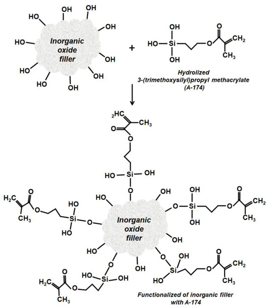 Proposed mechanism of reaction between 3-(trimethoxysilyl)propyl methacrylate (A-174) and the surface of the inorganic oxide fillers.