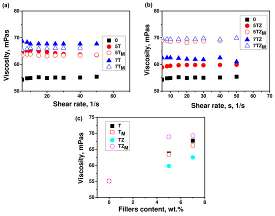 The viscosity of a UV-curable formulation is a very important parameter that affects the UV reactivity of the system and the polymerization rate. Figure 8 shows the viscosity of the monomer/filler dispersions as a function of the shear rate and the content and type of the filler. Measurements were taken at 20 °C, which was the temperature used for the kinetic studies and the preparation of the composites. The introduction of inorganic oxide fillers to the acrylate monomer modified its rheological properties, with the effect depending on the nature of the filler (modification, type, and amount of filler). The measured viscosity of the monomer without fillers presented Newtonian behavior with an apparent viscosity of 55 mPa·s, which is comparable to the data from the literature [45]. The results demonstrate that the addition of even a small amount of prepared inorganic oxide filler (unmodified or modified) increases the initial viscosity of the system. The addition of 5 wt.% of unmodified TiO2 and TiO2-ZrO2 caused an increase in the viscosity of the compositions, respectively, by ~15% and ~8.5%. The applied modifications of the initial TiO2 had different effects on the viscosity of the composition. This may result on the one hand from a change in the size of the filler particles, and on the other hand from a change in monomer–filler interactions. After the modification of TiO2 with ZrO2, a decrease in viscosity is observed. The modification of TiO2 with the silane coupling agent A-174 also reduced the viscosity of the composition, but the decrease was insignificant. On the other hand, the modification of the TZ filler with a silane coupling agent results in a significant increase in the viscosity of the composition, relative to the viscosities produced by the use of both unmodified TZ and T samples (TiO2-ZrO2 and TiO2 fillers).