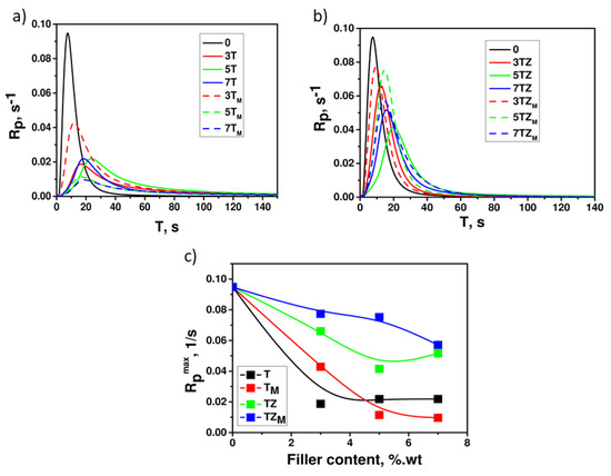 Kinetic curves of polymerization of PEGDA containing (a) T/TM; (b) TZ/TZM filters and (c) Maximum polymerization rate Rpmax depending on filler content. The numbers indicate filler content (in wt.%).