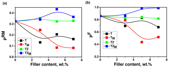 Double-bond conversion (a) at Rpmax (pRM) and (b) final (pF) as functions of the filler content in PEGDA containing samples T, TM, TZ, and TZM.