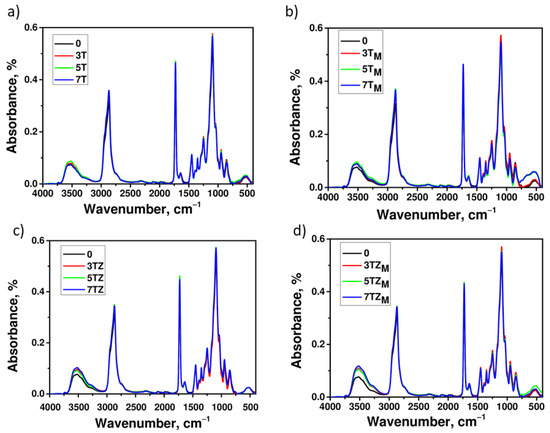 FTIR spectra recorded for the samples of polymer and polymer composite containing (a) T; (b) TM; (c) TZ; and (d) TZM. The numbers indicate filler content (in wt.%).