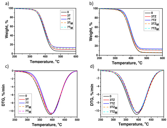 Thermal decomposition of polymer and polymer composite containing: (a) T/TM; (b) TZ/TZM and DTG curves: (c) T/TM; (d) TZ/TZM. The numbers indicate filler content (in wt.%).