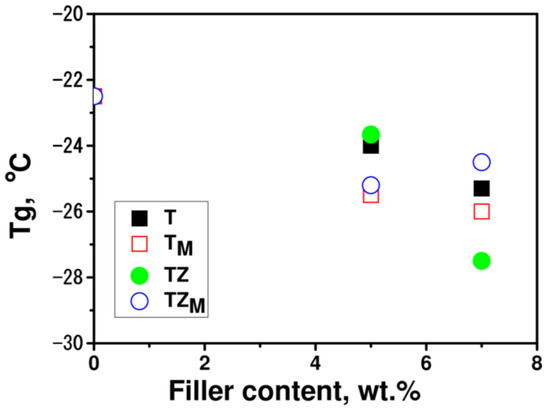 Glass transition temperatures, Tg, of polymer matrix and composites with various types and concentrations of fillers T, TM, TZ, and TZM determined from the first heating cycle.