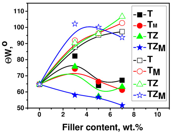 Water contact angle, θW, before (filled symbols) and after (unfilled symbols) UV-curing, as a function of the filler content in polyPEGDA/filler composites containing the fillers T, TM, and TZ, TZM.