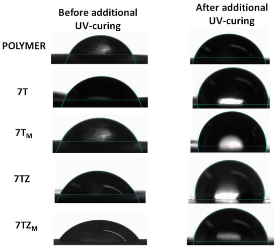 Water contact angle, θW, before and after additional UV curing for polymer and composites containing 7 wt.% of samples T, TM and TZ, TZM.
