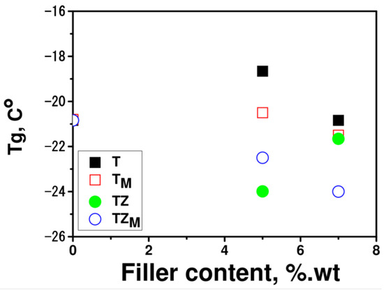 DSC measurements enabled the determination of glass transition temperatures of the pure polymer matrix polyPEGDA and the prepared composites with various types and concentrations of fillers. The glass transition temperature of pure polyPEGDA was −22.5 °C; thus, the prepared polymer is an elastomer (Figure 14). The addition of synthesized fillers decreased the glass transition temperature of the polymer matrix by approximately 0.5 to 3.0 °C, depending on the type of filler and its concentration in the composite. The silane-modified fillers TM and TZM exerted a greater effect. The decrease in this parameter may be related to the breaking of interchain bonding in PEGDA by the filler, and hydrophobic silane groups may have a greater influence on this effect.